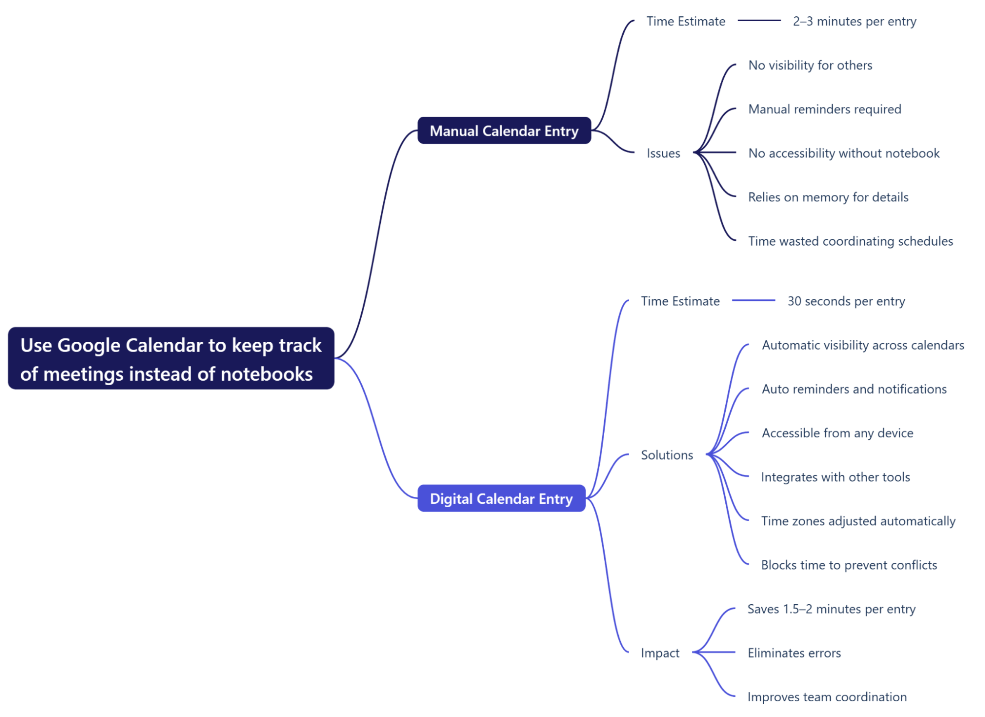 For instance, as shown in the mind map, replacing manual meeting tracking with Google Calendar can significantly improve efficiency. The shift reduces time spent on manual entries, eliminates errors, and enhances team coordination by providing automatic visibility and reminders. With these changes, their team could focus on delivering quality work, not hunting for data.